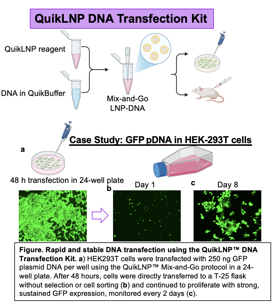 | QuikLNP DNA | GT80001 | 0.1 | Instrument-free mix-and-go LNP kit for in vitro and in vivo DNA delivery | 280 |